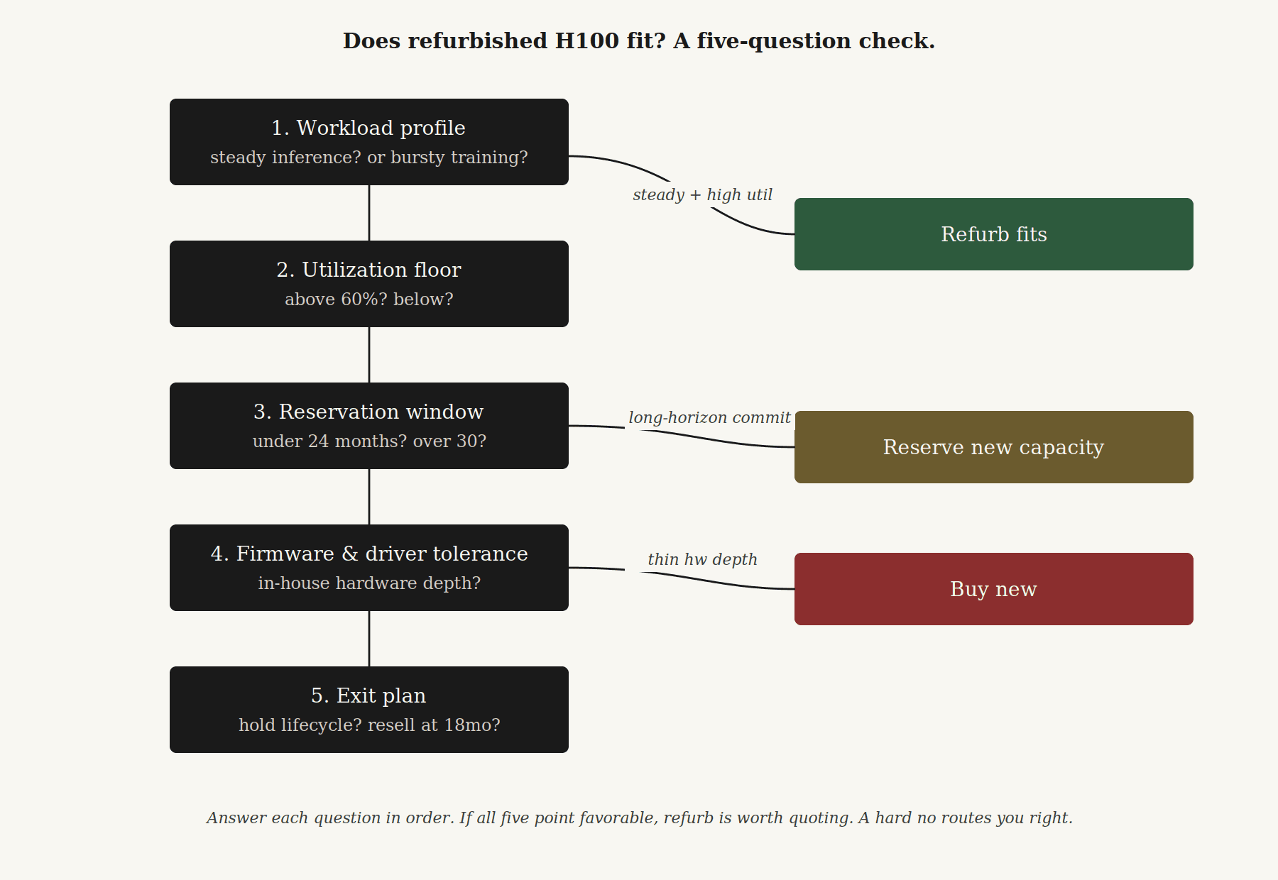 If the answers to questions 1, 2, 4, and 5 all come up favorable — steady inference, high utilization, in-house hardware capability, resale-aware exit — refurbished is worth running the full quote on. If any of them is a hard no, the answer is either reserve new capacity (for long-horizon commitments) or buy new outright.
