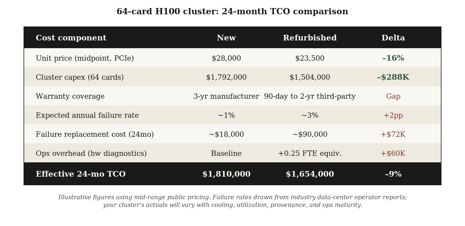 5. Exit plan. Refurbished H100s hold 75–85% of value for the first ~24 months. If your exit plan is to resell into the aftermarket at month 18, refurbished is a reasonable holding strategy. If your exit plan is to run the cards to end-of-life, you're paying for utility, not resale optionality — and new-unit economics may look closer to parity than the sticker suggests.