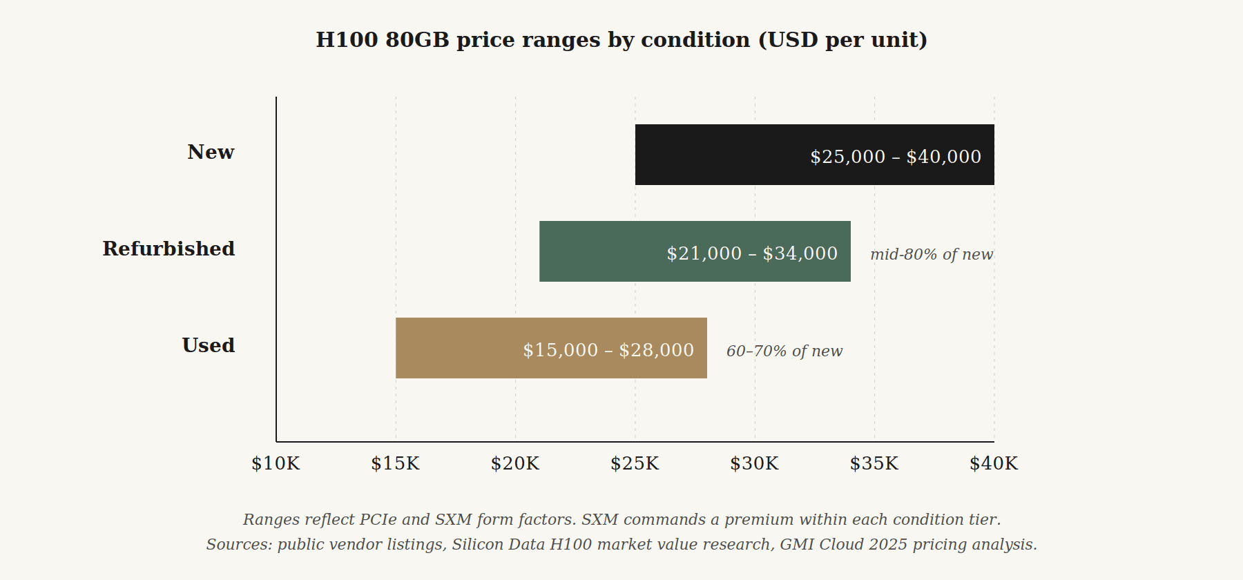 Sources: public vendor listings (Alta Technologies, eBay Certified Refurbished, Optdex), GMI Cloud 2025 pricing analysis, Silicon Data H100 market value research. Ranges are indicative, not TCEX proprietary quotes.