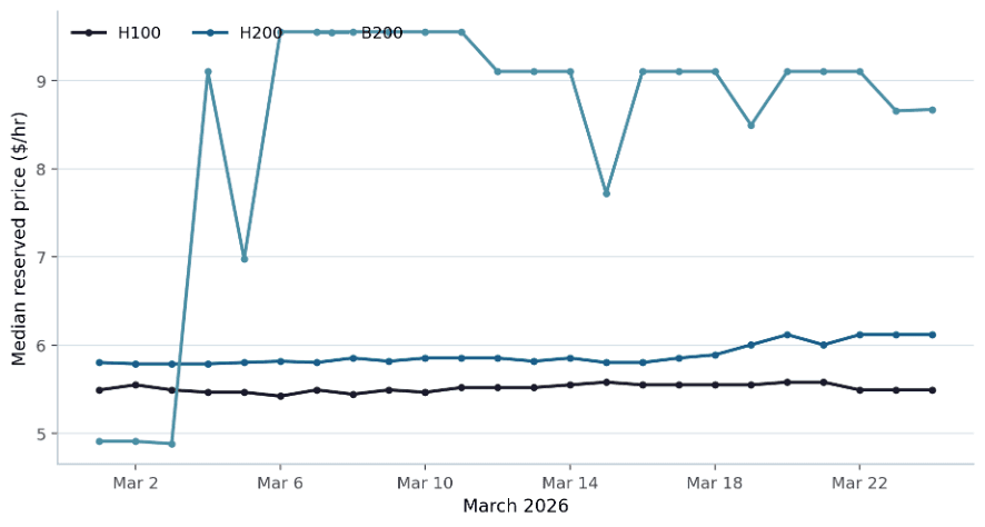 Figure 1. Daily median reserved price from the uploaded CSV (reserved rows only). H100 and H200 medians were comparatively stable through March, while B200 reset sharply upward after the first week.